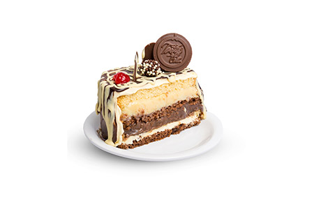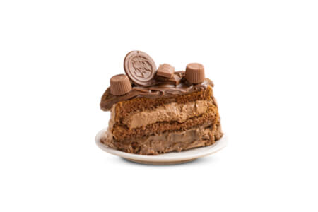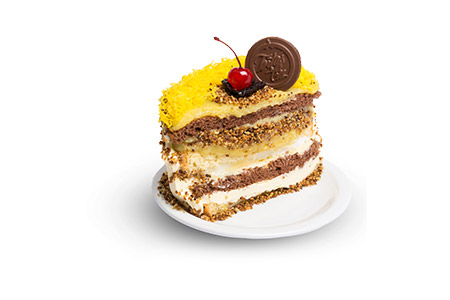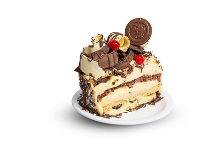 Pão-de-ló de chocolate e branco, nata, disco de merengão, creme de ovos com castanha de caju. Cobertura: Nata, castanha de caju, fios de ovos, ameixa e cerejas.