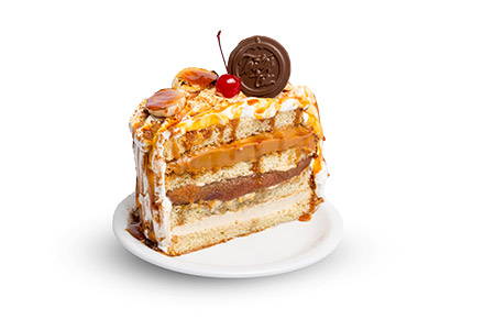 Pão-de-ló branco, creme de leite fresco com açúcar mascavo e canela, banana caramelada, doce de leite cremoso. Cobertura: Chantili, canela e banana flambada com calda.