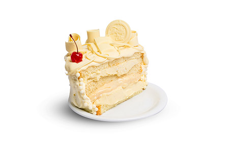 Pão-de-ló branco, recheio cremoso de chocolate branco, com pedaços de galak e branquinho. Cobertura: banho de ganache de chocolate branco com detalhes delicados de chocolates.